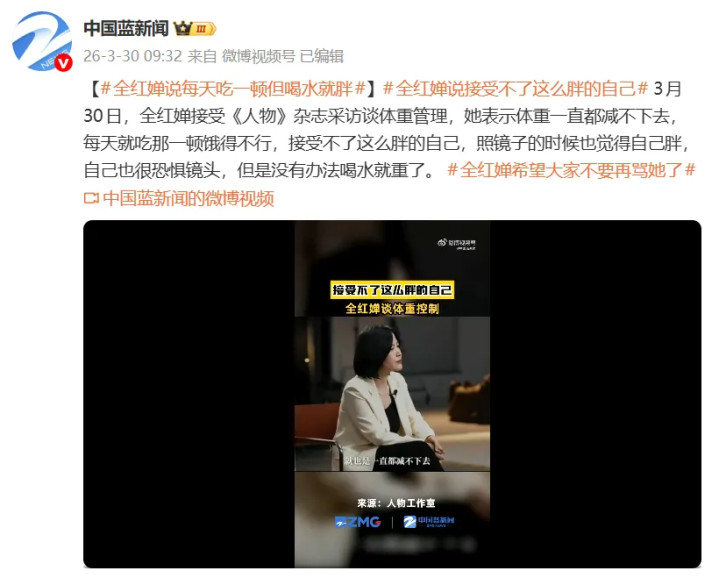 另据中国蓝新闻3月30日音信,全红婵汲取《东说念主物》杂志采访谈体重处置,她暗示巴黎奥运后我方来了例假,体重一直王人减不下去,每天就吃那一顿饿得不可,汲取不了这样胖的我方,照镜子的时候也合计我方胖,我方也很懦弱镜头,可是莫得方针喝水就重了。