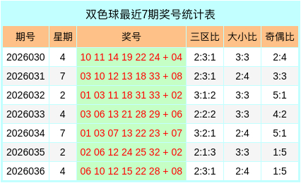 当期红球号码大小比为3:3,三区比为3:1:2,奇偶比为2:4,3组连号02,03,04,31,32。蓝球开出【小偶】形态的号码4。