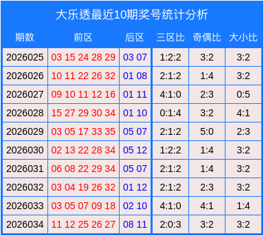 其中前区的三区比为2:0:3,奇偶比为3:2,大小比为3:2。