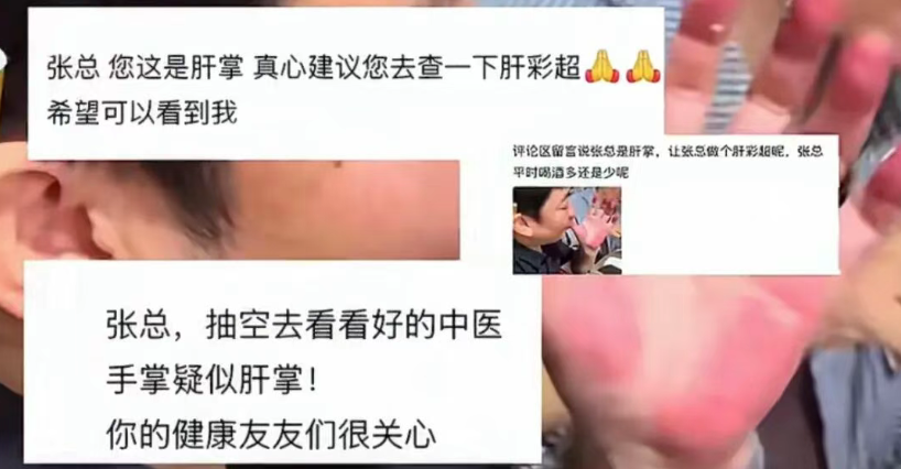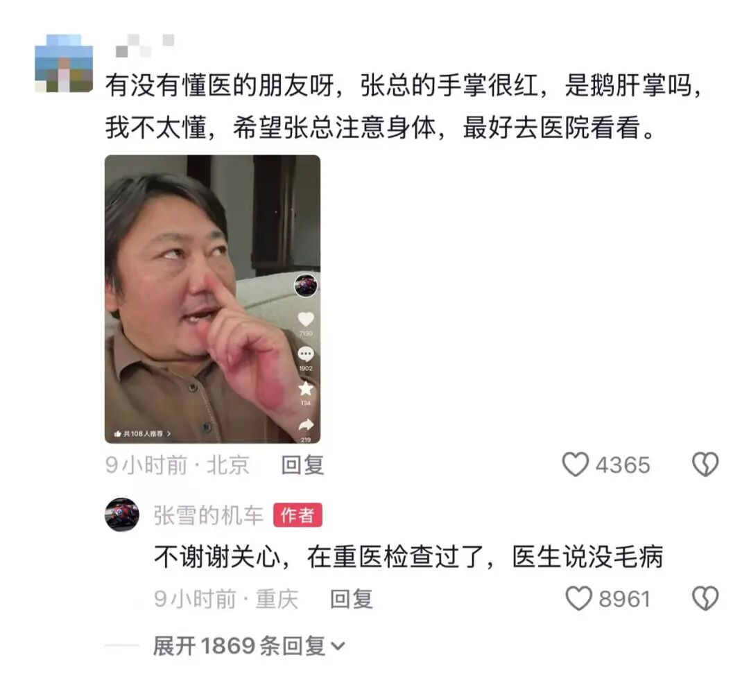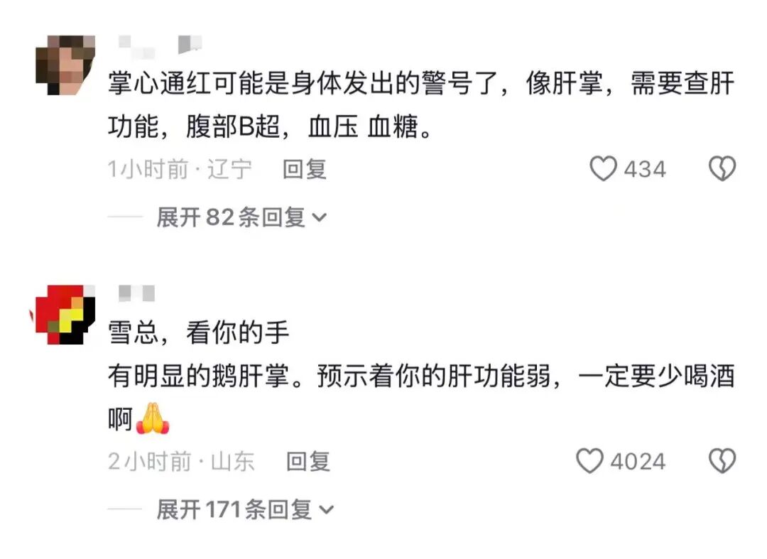 在商量区,有网友注目到张雪的手掌太红,不少东说念主测度可能是“肝掌”,有东说念主劝张雪实时就医。