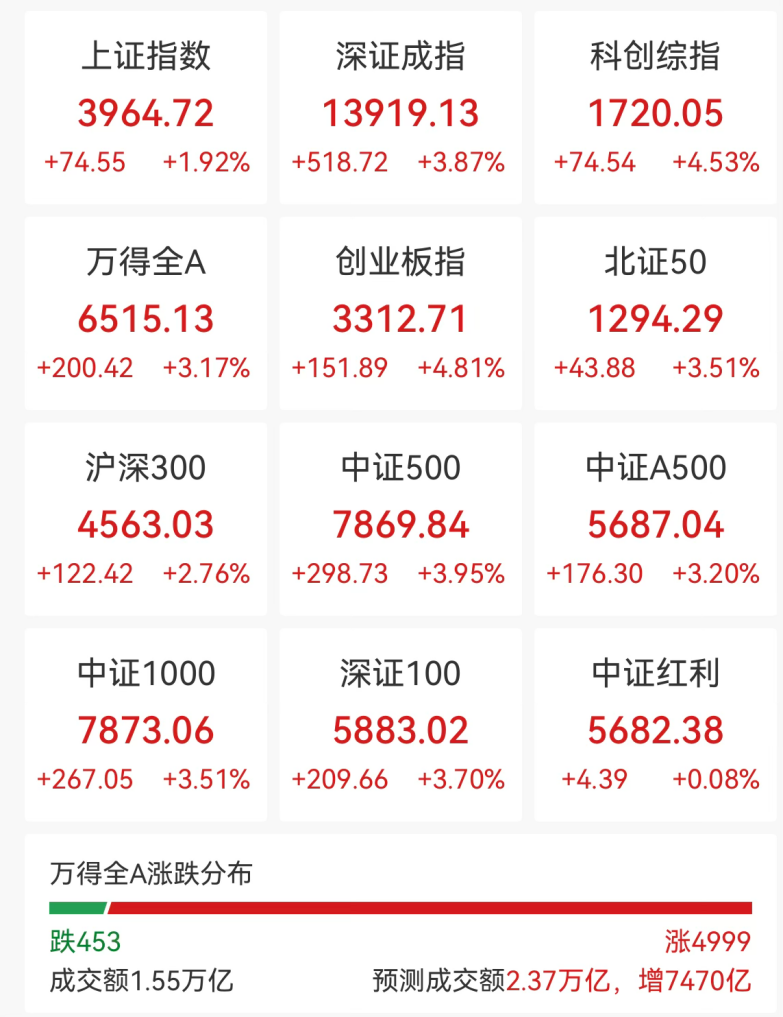 4月8日,A股主要指数高开高走,法则上昼收盘,上证指数上升1.92%,上升特出70点;深证成指上升3.87%,创业板指上升4.81%,科创综指上升4.53%。