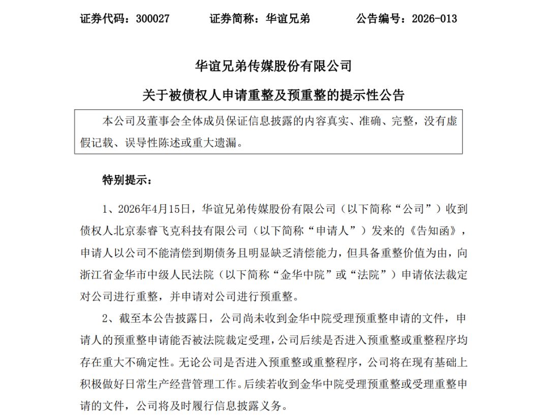 4月15日,华谊昆玉传媒股份有限公司(华谊昆玉,300027.SZ)公告,当日,公司收到债权东说念主北京泰睿飞克科技有限公司(以下简称“恳求东说念主”)发来的《陈述函》,恳求东说念主以公司不行返璧到期债务且明显枯竭返璧才气,但具备重整价值为由,向浙江省金华市中级东说念主民法院(以下简称“金华中院”或“法院”)恳求照章裁定对公司进行重整,并恳求对公司进行预重整。