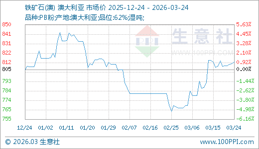 铁矿石03月24日最新价钱813.56元/吨,最近20天高涨5.75%。