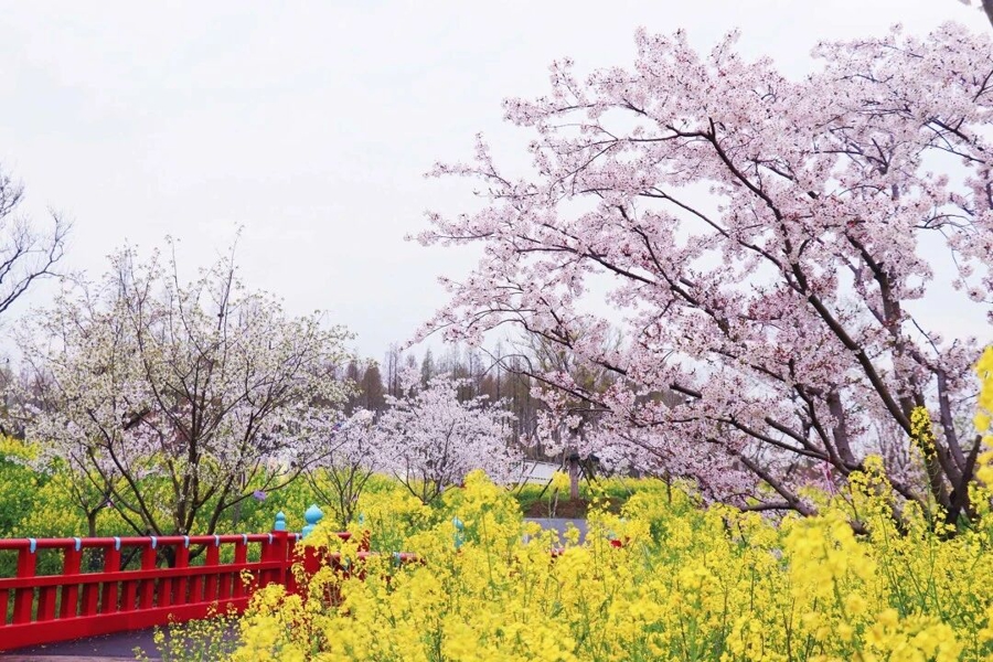 公园内,百樱林的早樱、金黄油菜花也安逸干涉最好不雅赏期,各色花朵如云似霞,让东说念主沦落不已。在千米紫藤长廊,大片长穗花藤交错垂落,白色、粉色、紫色的长穗紫藤竞相怒放,造成一条汗漫的花雨长廊。