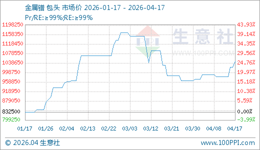 金属镨04月17日最新价钱1045000.00万元/吨,最近5天高涨6.63%,20天高涨8.29%,90天高涨25.53%。