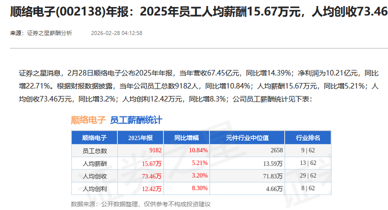 行动对比,证券之星数据清醒,2025年,顺络电子职工东说念主均薪酬为15.67万元,上年同时为14.89万元,同比增长约5.2%。